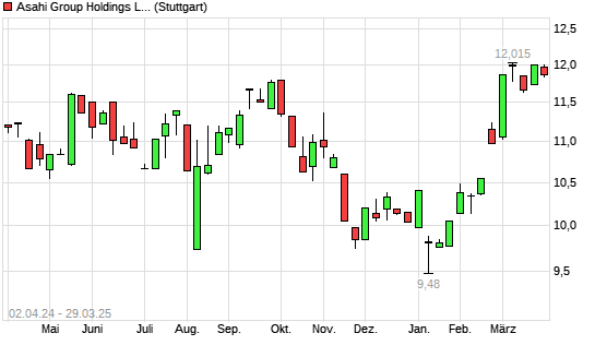 Mit dem Anstieg auf 12,09 EUR hat die Asahi Group-Aktie (ISIN JP3116000005) am 28.03.2025 ein neues 12-Monats-Hoch erreicht und damit den Kurs vom 26.09.2024 eingestellt.