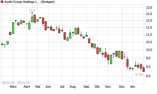 Mit dem Rücksetzer auf 8,83 EUR hat die Asahi Group-Aktie (ISIN JP3116000005) am 27.01.2026 ein neues 5-Jahres-Tief erreicht und damit den Kurs vom 23.12.2025 eingestellt.