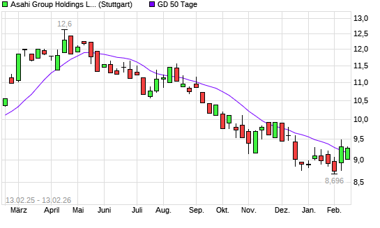 Mit dem Rücksetzer auf 9,10 EUR hat die Asahi Group-Aktie am 12.02.2026 die 50-Tage-Linie nach unten gekreuzt.