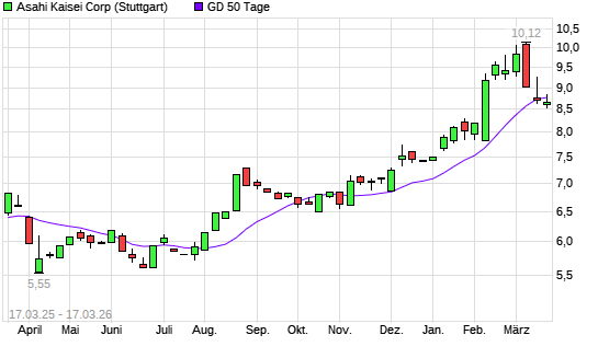 Mit dem Rücksetzer auf 8,64 EUR hat die Asahi Kasei-Aktie am 16.03.2026 die 50-Tage-Linie nach unten gekreuzt.