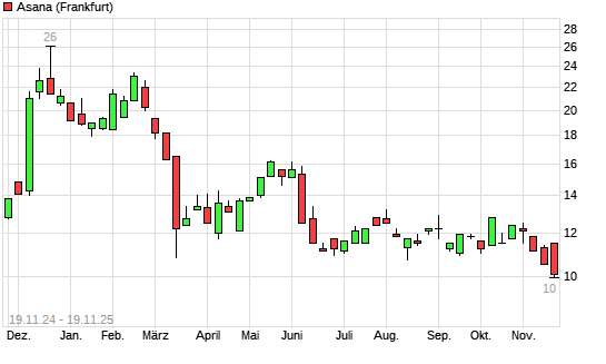 Mit dem Rücksetzer auf 10,00 EUR hat die Asana-Aktie (ISIN US04342Y1047) am 18.11.2025 ein neues 12-Monats-Tief erreicht und damit den Kurs vom 14.11.2025 eingestellt.