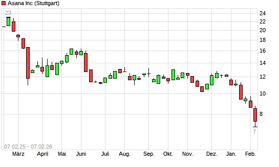 Mit dem Rücksetzer auf 6,75 EUR hat die Asana-Aktie (ISIN US04342Y1047) am 06.02.2026 ein neues All-Time-Low erreicht und damit den Kurs vom 05.02.2026 eingestellt.