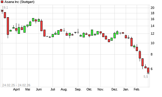 Mit dem Rücksetzer auf 5,80 EUR hat die Asana-Aktie (ISIN US04342Y1047) am 23.02.2026 ein neues All-Time-Low erreicht und damit den Kurs vom 18.02.2026 eingestellt.