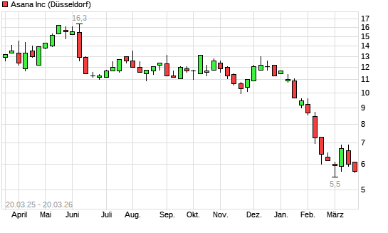 Mit dem Rücksetzer auf 5,55 EUR hat die Asana-Aktie (ISIN US04342Y1047) am 19.03.2026 ein neues All-Time-Low erreicht und damit den Kurs vom 25.02.2026 eingestellt.