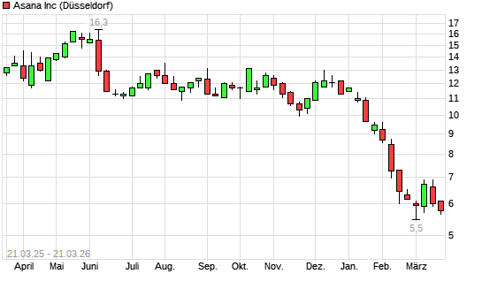 Mit dem Rücksetzer auf 5,45 EUR hat die Asana-Aktie (ISIN US04342Y1047) am 20.03.2026 ein neues All-Time-Low erreicht und damit den Kurs vom 19.03.2026 eingestellt.