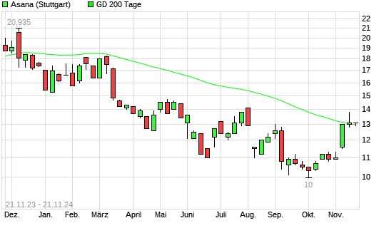 Mit dem Anstieg auf 12,80 EUR hat die Asana-Aktie am 20.11.2024 die 200-Tage-Linie nach oben gekreuzt.