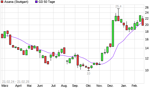 Mit dem Rücksetzer auf 20,40 EUR hat die Asana-Aktie am 20.02.2025 die 50-Tage-Linie nach unten gekreuzt.