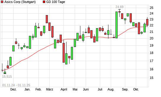 Mit dem Anstieg auf 22,07 EUR hat die Asics-Aktie am 31.10.2025 die 100-Tage-Linie nach oben gekreuzt.