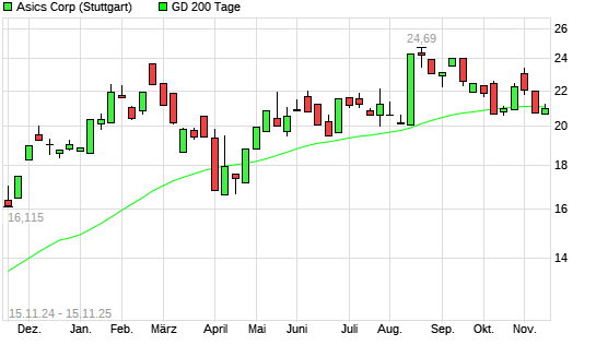 Mit dem Rücksetzer auf 20,97 EUR hat die Asics-Aktie am 14.11.2025 die 200-Tage-Linie nach unten gekreuzt.