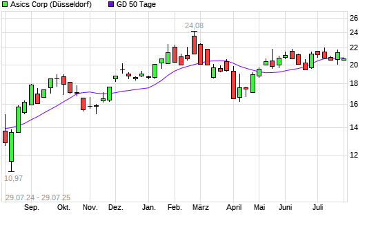 Mit dem Rücksetzer auf 20,62 EUR hat die Asics-Aktie am 28.07.2025 die 50-Tage-Linie nach unten gekreuzt.