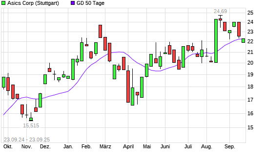 Mit dem Rücksetzer auf 22,25 EUR hat die Asics-Aktie am 22.09.2025 die 50-Tage-Linie nach unten gekreuzt.