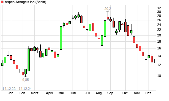 Mit dem Rücksetzer auf 12,40 EUR hat die Aspen Aerogels-Aktie (ISIN US04523Y1055) am 13.12.2024 ein neues 6-Monats-Tief erreicht und damit den Kurs vom 09.12.2024 eingestellt.