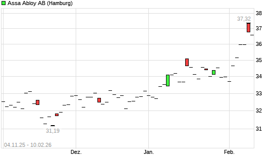 Mit dem Anstieg auf 36,77 EUR hat die Assa Abloy AB B-Aktie (ISIN SE0007100581) am 09.02.2026 ein neues All-Time-High erreicht und damit den Kurs vom 05.02.2026 eingestellt.