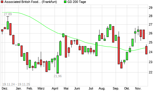 Mit dem Rücksetzer auf 23,80 EUR hat die Associated British Foods-Aktie am 18.11.2025 die 200-Tage-Linie nach unten gekreuzt.