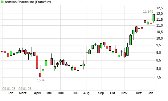 Mit dem Anstieg auf 11,68 EUR hat die Astellas Pharma-Aktie (ISIN JP3942400007) am 08.01.2026 ein neues 12-Monats-Hoch erreicht und damit den Kurs vom 07.01.2026 eingestellt.