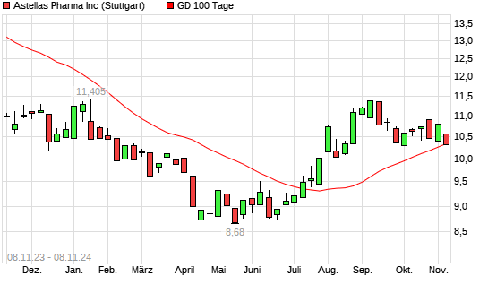 Mit dem Rücksetzer auf 9,95 EUR hat die Astellas Pharma-Aktie am 07.11.2024 die 100-Tage-Linie nach unten gekreuzt.