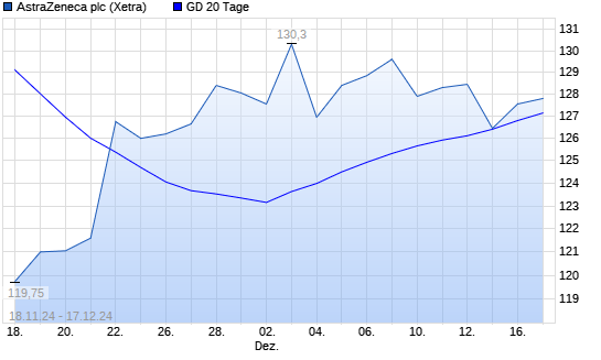 Mit dem Rücksetzer auf 126,75 EUR hat die Astrazeneca-Aktie am 16.12.2024 die 20-Tage-Linie nach unten gekreuzt.