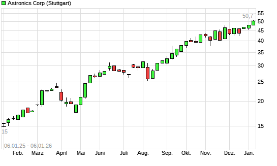 Mit dem Anstieg auf 50,00 EUR hat die Astronics-Aktie (ISIN US0464331083) am 05.01.2026 ein neues All-Time-High erreicht und damit den Kurs vom 27.11.2025 eingestellt.