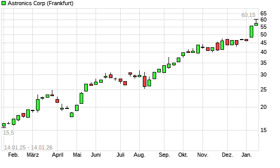 Mit dem Anstieg auf 60,15 EUR hat die Astronics-Aktie (ISIN US0464331083) am 13.01.2026 ein neues All-Time-High erreicht und damit den Kurs vom 12.01.2026 eingestellt.
