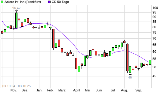 Mit dem Anstieg auf 54,30 EUR hat die Atkore-Aktie am 02.10.2025 die 50-Tage-Linie nach oben gekreuzt.