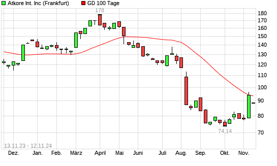 Mit dem Rücksetzer auf 88,22 EUR hat die Atkore-Aktie am 11.11.2024 die 100-Tage-Linie nach unten gekreuzt.