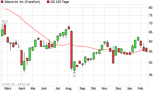 Mit dem Rücksetzer auf 54,84 EUR hat die Atkore-Aktie am 13.02.2026 die 100-Tage-Linie nach unten gekreuzt.