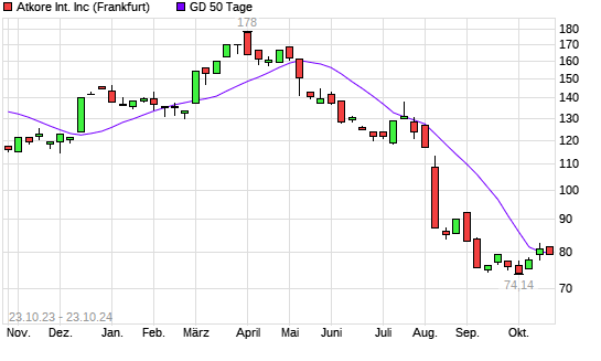 Mit dem Rücksetzer auf 79,34 EUR hat die Atkore-Aktie am 22.10.2024 die 50-Tage-Linie nach unten gekreuzt.