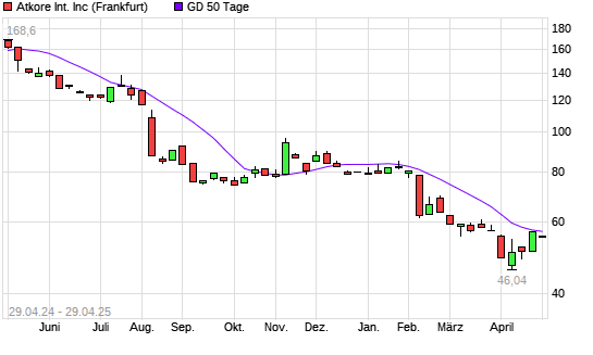 Mit dem Rücksetzer auf 55,56 EUR hat die Atkore-Aktie am 28.04.2025 die 50-Tage-Linie nach unten gekreuzt.