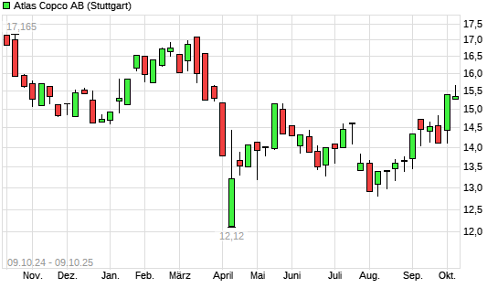 Mit dem Anstieg auf 15,53 EUR hat die Atlas Copco A-Aktie (ISIN SE0017486889) am 08.10.2025 ein neues 6-Monats-Hoch erreicht und damit den Kurs vom 06.10.2025 eingestellt.