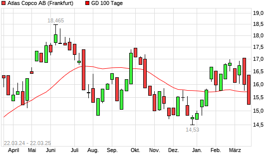 Mit dem Rücksetzer auf 15,25 EUR hat die Atlas Copco A-Aktie am 21.03.2025 die 100-Tage-Linie nach unten gekreuzt.