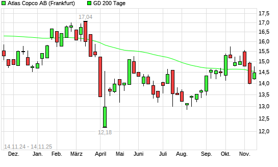 Mit dem Rücksetzer auf 14,48 EUR hat die Atlas Copco A-Aktie am 13.11.2025 die 200-Tage-Linie nach unten gekreuzt.