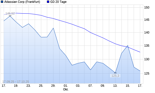 Mit dem Rücksetzer auf 127,28 EUR hat die Atlassian-Aktie am 16.10.2025 die 20-Tage-Linie nach unten gekreuzt.