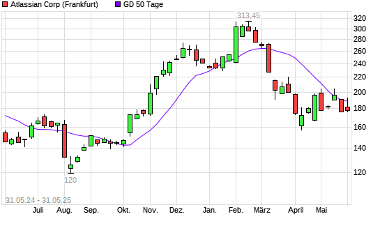 Mit dem Rücksetzer auf 177,94 EUR hat die Atlassian-Aktie am 30.05.2025 die 50-Tage-Linie nach unten gekreuzt.