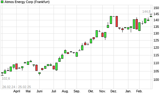Mit dem Anstieg auf 144,25 EUR hat die Atmos Energy-Aktie (ISIN US0495601058) am 24.02.2025 ein neues All-Time-High erreicht und damit den Kurs vom 28.11.2024 eingestellt.