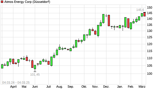 Mit dem Anstieg auf 146,05 EUR hat die Atmos Energy-Aktie (ISIN US0495601058) am 03.03.2025 ein neues All-Time-High erreicht und damit den Kurs vom 24.02.2025 eingestellt.