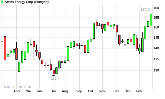 Mit dem Anstieg auf 157,05 EUR hat die Atmos Energy-Aktie (ISIN US0495601058) am 27.02.2026 ein neues All-Time-High erreicht und damit den Kurs vom 12.11.2025 eingestellt.