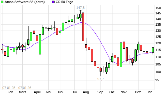 Mit dem Rücksetzer auf 112,00 EUR hat die Atoss Software-Aktie am 06.01.2026 die 50-Tage-Linie nach unten gekreuzt.