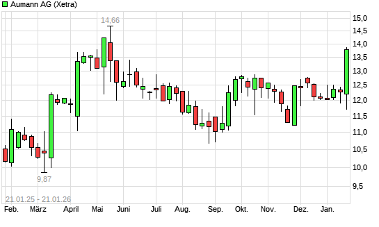 Mit dem Anstieg auf 13,18 EUR hat die Aumann-Aktie (ISIN DE000A2DAM03) am 20.01.2026 ein neues 6-Monats-Hoch erreicht und damit den Kurs vom 16.10.2025 eingestellt.