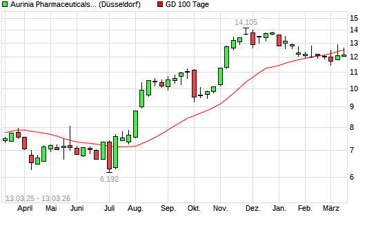 Mit dem Rücksetzer auf 12,39 EUR hat die Aurinia Pharmaceuticals-Aktie am 12.03.2026 die 100-Tage-Linie nach unten gekreuzt.