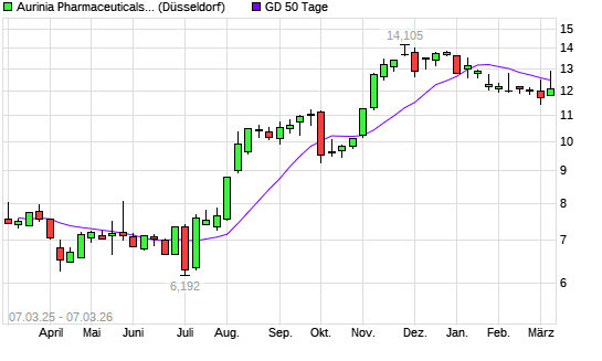 Mit dem Rücksetzer auf 12,25 EUR hat die Aurinia Pharmaceuticals-Aktie am 06.03.2026 die 50-Tage-Linie nach unten gekreuzt.