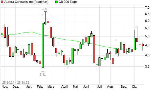 Mit dem Anstieg auf 4,47 EUR hat die Aurora Cannabis-Aktie am 24.10.2025 die 200-Tage-Linie nach oben gekreuzt.