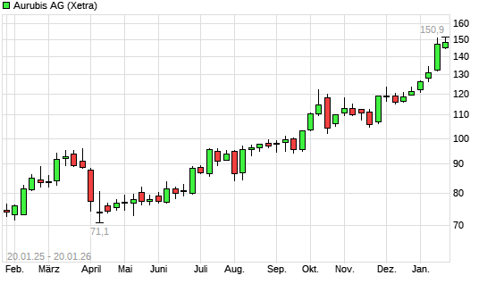 Mit dem Anstieg auf 150,20 EUR hat die Aurubis-Aktie (ISIN DE0006766504) am 19.01.2026 ein neues All-Time-High erreicht und damit den Kurs vom 16.01.2026 eingestellt.