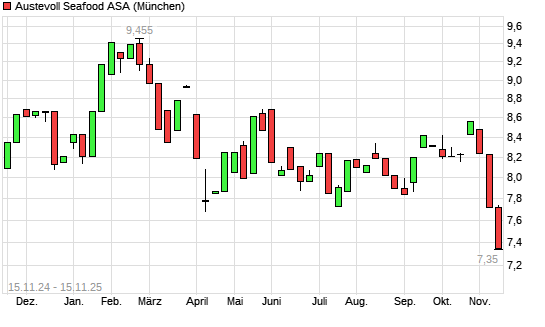 Mit dem Rücksetzer auf 7,43 EUR hat die Austevoll Seafood-Aktie (ISIN NO0010073489) am 14.11.2025 ein neues 12-Monats-Tief erreicht und damit den Kurs vom 13.11.2025 eingestellt.