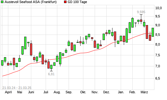 Mit dem Anstieg auf 8,70 EUR hat die Austevoll Seafood-Aktie am 20.03.2025 die 100-Tage-Linie nach oben gekreuzt.