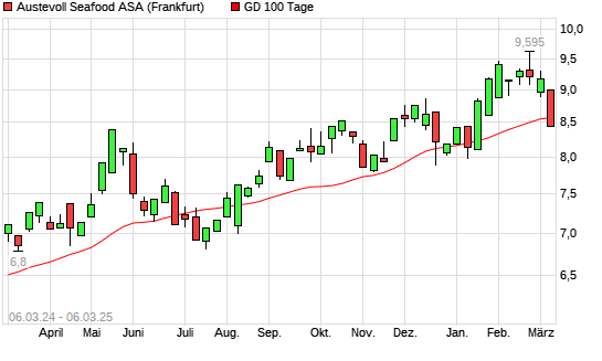 Mit dem Rücksetzer auf 8,45 EUR hat die Austevoll Seafood-Aktie am 05.03.2025 die 100-Tage-Linie nach unten gekreuzt.