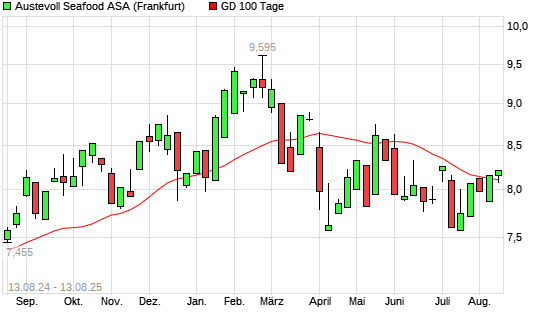 Mit dem Rücksetzer auf 8,08 EUR hat die Austevoll Seafood-Aktie am 12.08.2025 die 100-Tage-Linie nach unten gekreuzt.