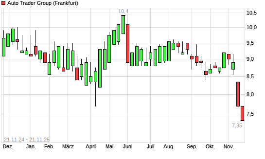Mit dem Rücksetzer auf 7,35 EUR hat die Auto Trader Group-Aktie (ISIN GB00BVYVFW23) am 20.11.2025 ein neues 12-Monats-Tief erreicht und damit den Kurs vom 19.11.2025 eingestellt.