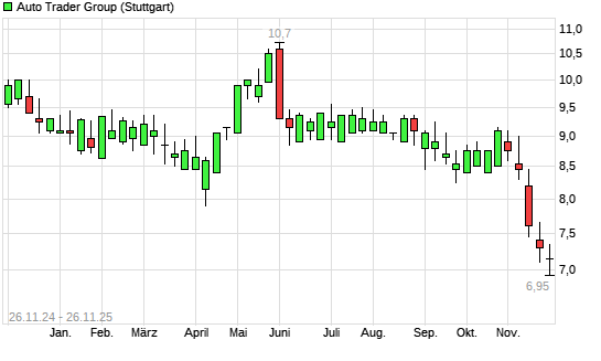 Mit dem Rücksetzer auf 7,30 EUR hat die Auto Trader Group-Aktie (ISIN GB00BVYVFW23) am 25.11.2025 ein neues 12-Monats-Tief erreicht und damit den Kurs vom 20.11.2025 eingestellt.