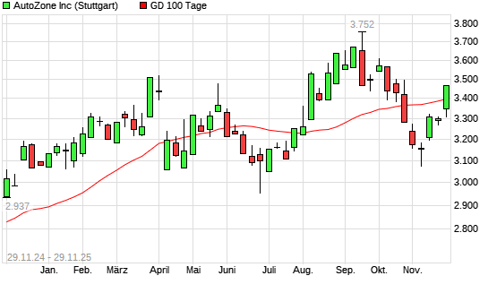 Mit dem Rücksetzer auf 3.403,00 EUR hat die AutoZone-Aktie am 28.11.2025 die 100-Tage-Linie nach unten gekreuzt.
