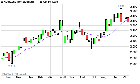 Mit dem Rücksetzer auf 3.486,00 EUR hat die AutoZone-Aktie am 07.10.2025 die 50-Tage-Linie nach unten gekreuzt.
